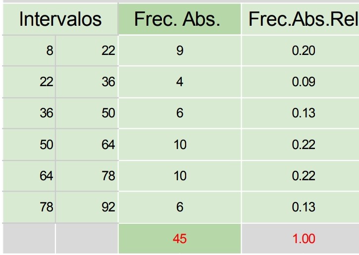 La frecuencia absoluta relativa se calcula dividiendo la frecuencia absoluta de cada intervalo por n (cantidad de elementos en la población de estudio)