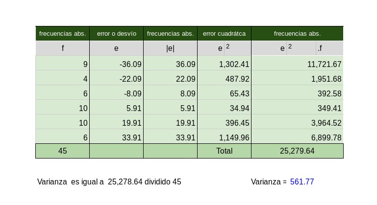 Al igual que en la distribución en una serie, se debe elevar al cuadrado el error o desvío, y luego multiplicar por la frecuencia, que son las veces que se repite ese error en el intervalo.